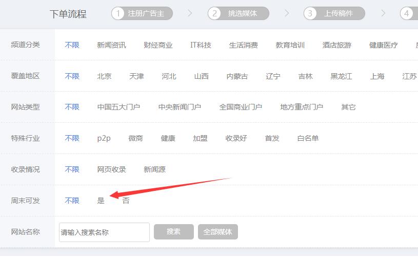 在媒介云平臺(tái)渠道列表頁(yè)面,可以篩選周末可發(fā)媒體,進(jìn)行快速選擇。