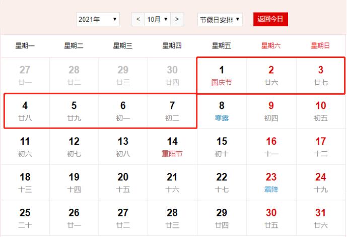 我公司定于2021年10月1日至7日放假7天,10月8日(周五)正式上班。節(jié)假日期間公司所有員工休息,提交的訂單將在10月8日上班后處理。
