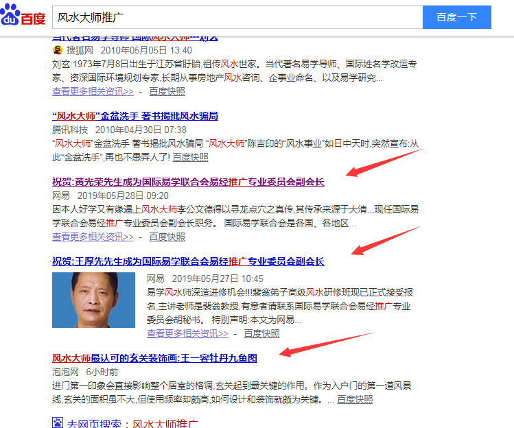 通過上圖我們可以看出,已經(jīng)有易經(jīng)風(fēng)水行業(yè)的大師在通過新聞媒體發(fā)聲,包裝宣傳自己了,通過大型知名門戶媒體,發(fā)布新聞稿件,對于人物品牌形象的打造效果是最快最明顯的,網(wǎng)易、騰訊媒體都是中國四大門戶網(wǎng)站,在國人心中有著很好的地位,可信度極高。塑造人物品牌度和美譽(yù)度是最佳的選擇。
