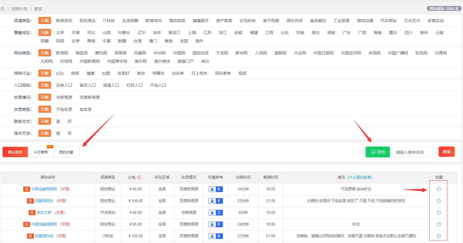 小竅門:如果需要導(dǎo)出自定義的部分媒體報(bào)價(jià),可以先自己篩選點(diǎn)擊收藏,進(jìn)入媒體收藏頁(yè)面,然后點(diǎn)擊【導(dǎo)出】就可以將自己收藏的媒體以表格形式導(dǎo)出本地了。