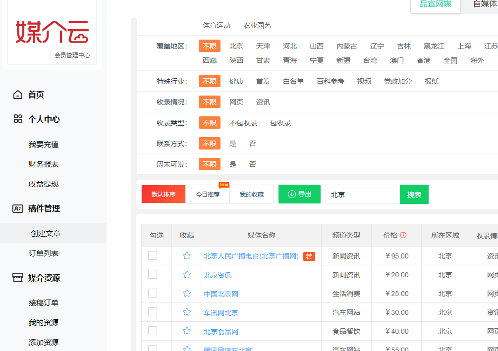 5、進(jìn)入媒體列表頁面后,這里媒體比較多,可以根據(jù)投放需求進(jìn)行索引,篩選北京,或者通過搜索框里輸“媒體名字”就能展示出媒體。勾選媒體確認(rèn)無誤后就可以提交訂單了。